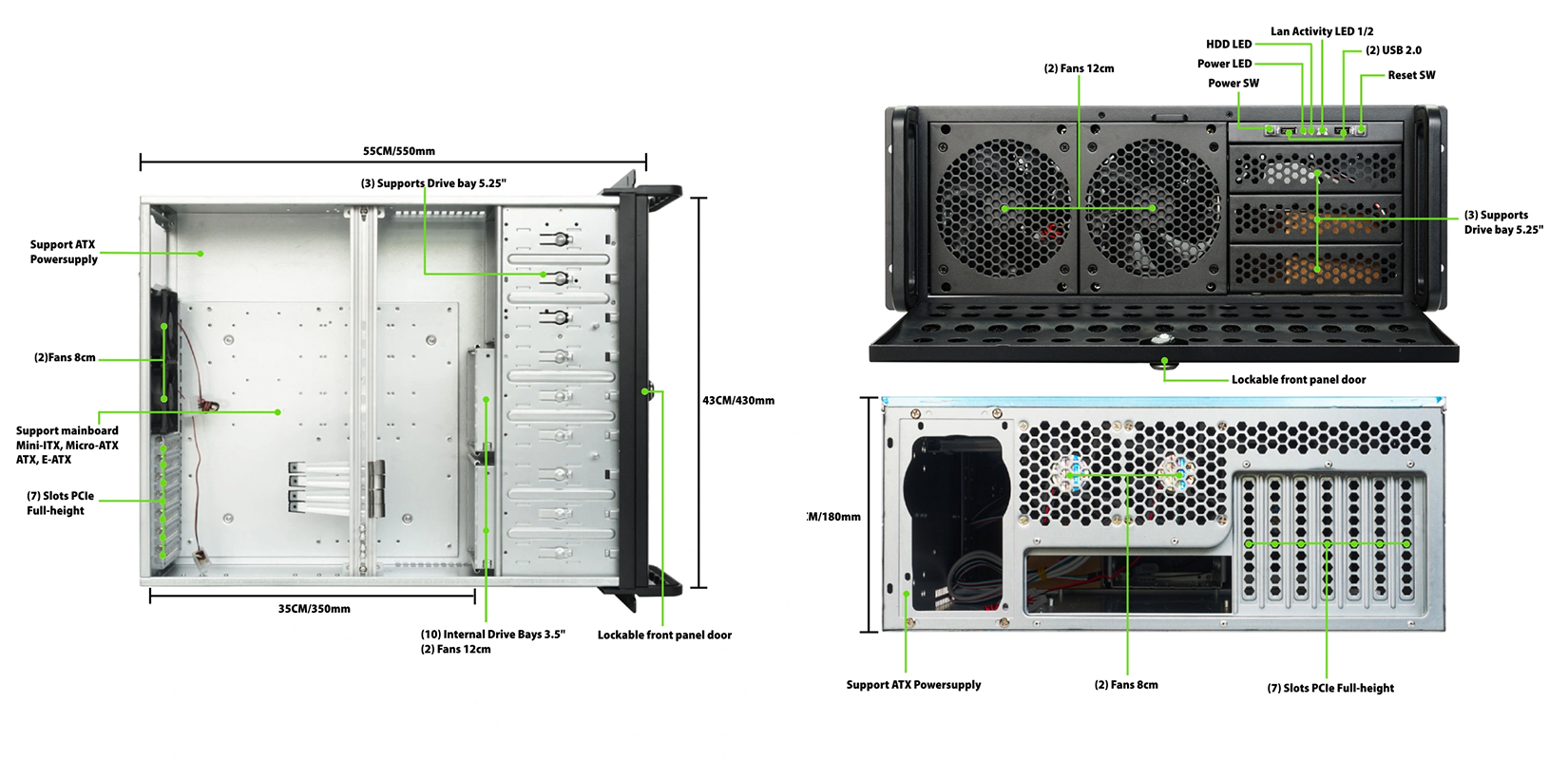 Motherboard Compatibility: Support CEB(12"x10.5"), ATX (12"x9.6"), Micro ATX (9.6" x 9.6")
